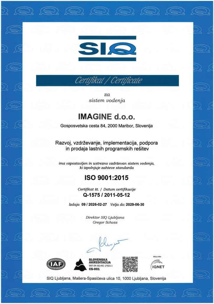 Kakovost storitev, urejenost poslovanja podjetja dokazujemo s standardom ISO 9001:2015, s katerim razpolagamo že več let. Le-ta je dokaz, da ima Imagine d.o.o. vzpostavljen in ustrezno vzdrževan sistem vodenja »RAZVOJ, VZDRŽEVANJE, IMPLEMENTACIJA, PODPORA IN PRODAJA LASTNIH PROGRAMSKIH REŠITEV«, ki izpolnjuje vse zahteve omenjenega standarda. Ustrezno informacijsko varnost in varovanje informacij na nivoju celotnega podjetja dokazujemo s standardom ISO/IEC 27001:2022. Da naše podjetje uspešno posluje v vseh razmerah smo dokazali z doseganjem zahtev standarda ISO 22301:2019 za neprekinjeno poslovanje, ki smo ga pridobili konec leta 2020, v času izrednih razmer v državi (pandemija koronavirusa). V letu 2022 smo pridobili še potrdilo o usklajenosti s standardom za oblačne storitve ISO/IEC 27017.